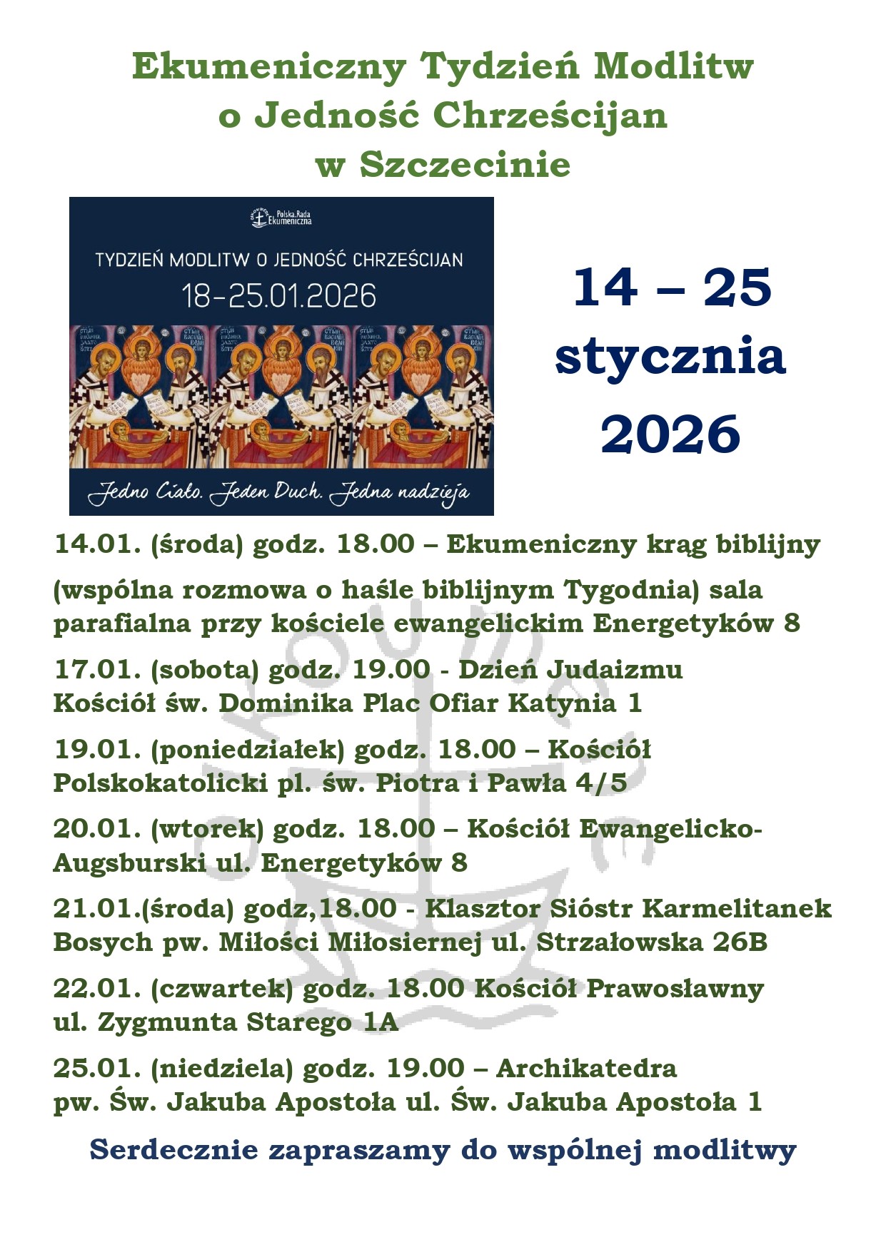 Tydzień Modlitw o Jedność Chrześcijan trwa od 18 do 25 stycznia. W roku 2026 rozważany jest biblijny tekst: Jedno ciało. Jeden Duch. Jedna nadzieja – zaczerpnięty z Listu ap. Pawła do Efezjan 4,1–13.