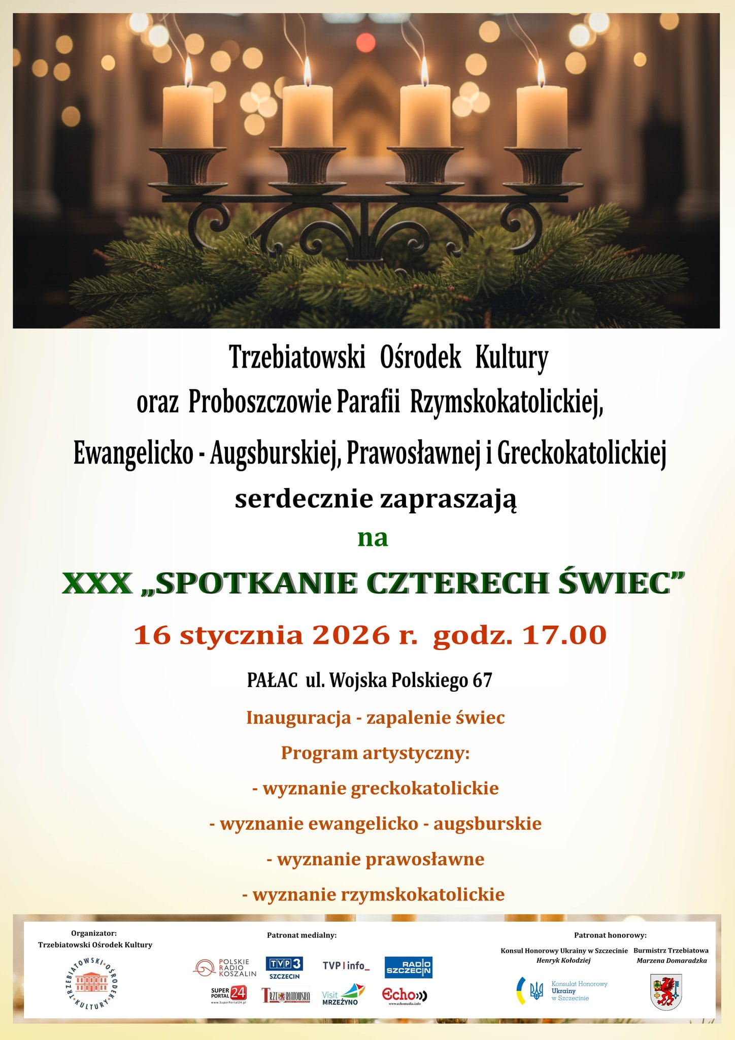 W piątek, 16 stycznia o godz. 17:00, w Pałacu przy ul. Wojska Polskiego 67 w Trzebiatowie odbędzie się XXX Spotkanie Czterech Świec – wydarzenie o szczególnym znaczeniu dla lokalnej społeczności, od trzydziestu lat budujące przestrzeń dialogu, wzajemnego szacunku i porozumienia.