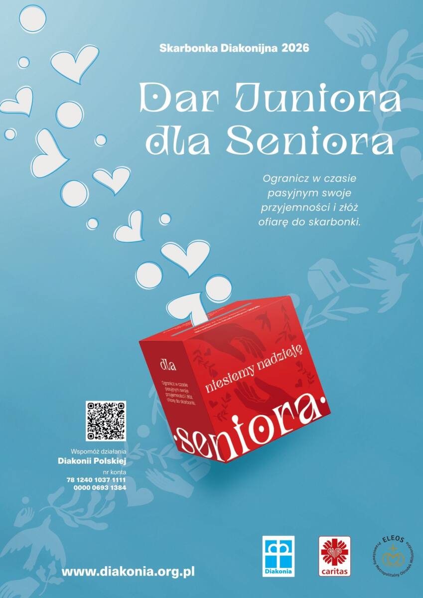 W naszej Parafii, przy ul. Energetyków 8 w Szczecinie, skarbonki są do pobrania przy wyjściu z kościoła. My też namawiamy do rezygnacji z pewnych przyjemności i wrzucania zaoszczędzonych w ten sposób pieniędzy do swoich skarbonek. W tym roku Skarbonka Diakonijna przeznaczona jest na potrzeby seniorów. Akcja nosi nazwę „Dar juniora dla seniora”, ale seniorów także zachęcamy do jej  wspierania. Co prawda senior ma więcej lat niż junior, ale w duchu każdy może czuć się młodo. Wszak dusza lat nie liczy, jest wiecznie młoda. I tego wszystkim życzymy!